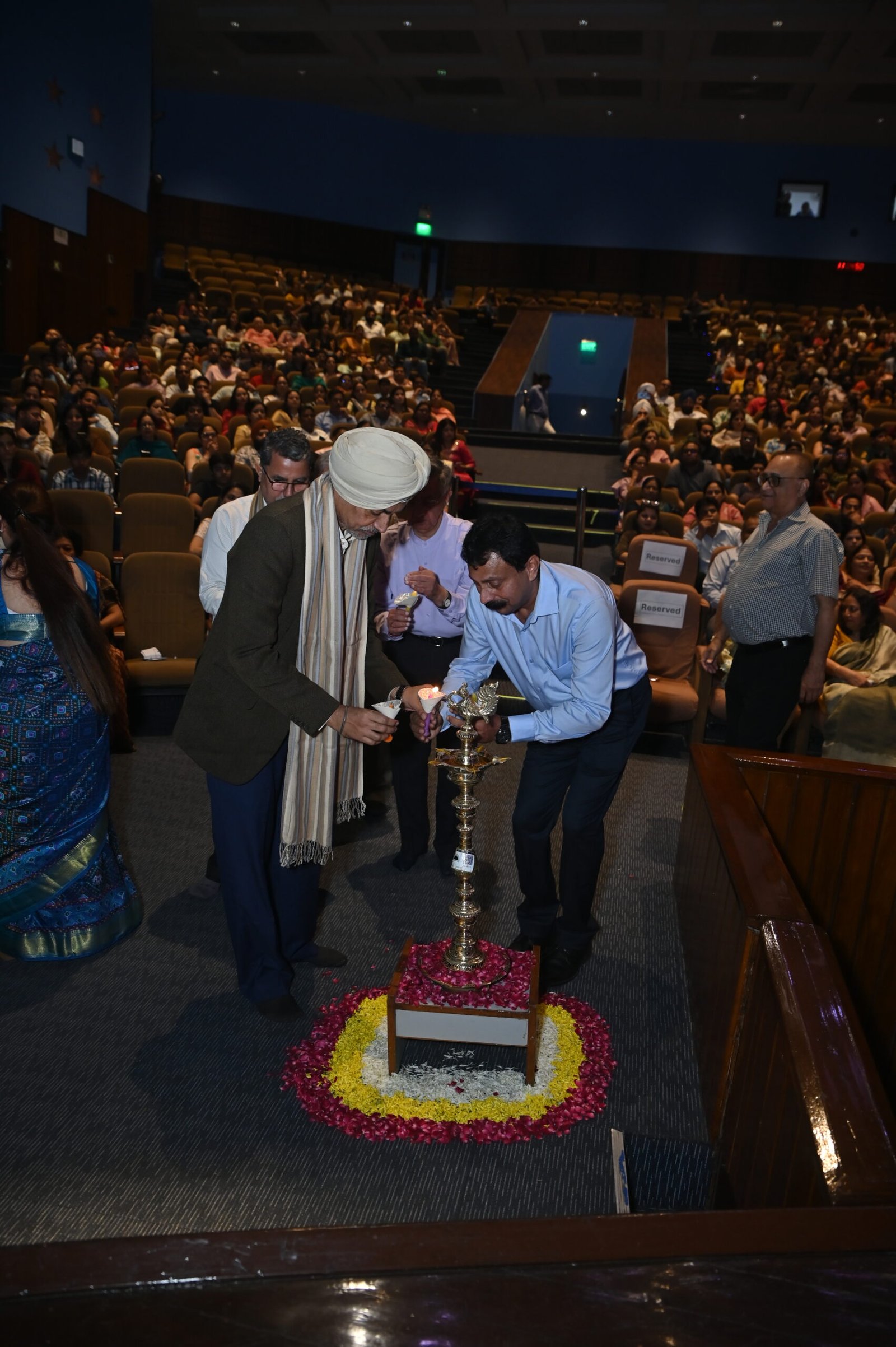 The celebration began with the lighting of the ceremonial lamp, signifying the triumph of knowledge over ignorance. The auditorium resonated with positivity as the sacred flame illuminated the path for an evening dedicated to art, learning, and reflection.