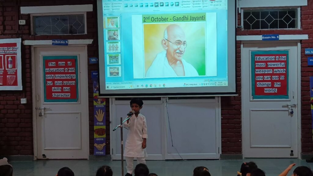 Salwan Montessori School celebrated Gandhi Jayanti with a lot of enthusiasm on Friday, 30 September 2025. To commemorate the birth anniversary of Mahatma Gandhi, the father of our nation, a special assembly was organized to assimilate the teachings of the great leader.