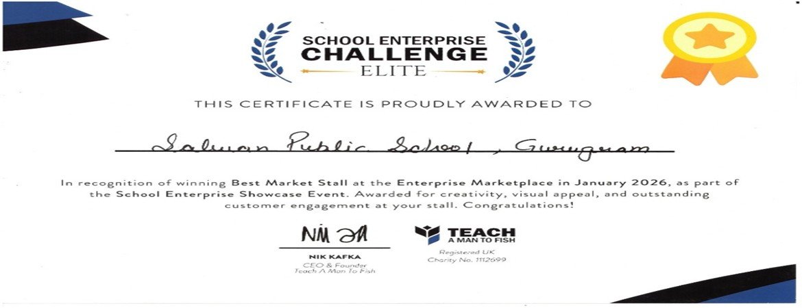Salwan Public School, Gurugram, has been awarded the ‘Best Market Stall’ at the Enterprise Marketplace (January 2026) as part of the School Enterprise Showcase Event held on 31st January 2026 at KIIT World School, Gurugram. The event provided a dynamic platform to nurture entrepreneurial thinking, innovation, and practical business skills among students through competitive segments such as Shark Tank and Market Place.