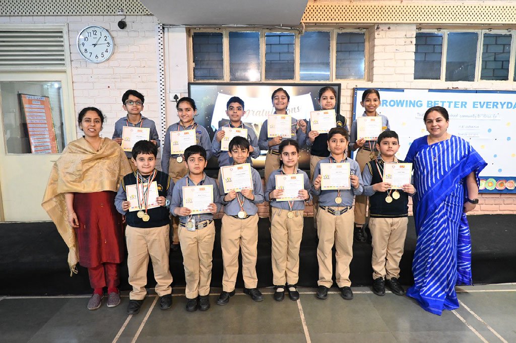 From Class V, Ridhaan Khurana secured School Rank 1 and qualified for Level 2 with a Gold Medal of Excellence. Hetansh Arora (School Rank 2) and Aarav Johar (School Rank 3) also earned Gold Medals of Excellence. The remarkable achievements of these students reflect their hard work, analytical skills, and dedication, making the school proud.