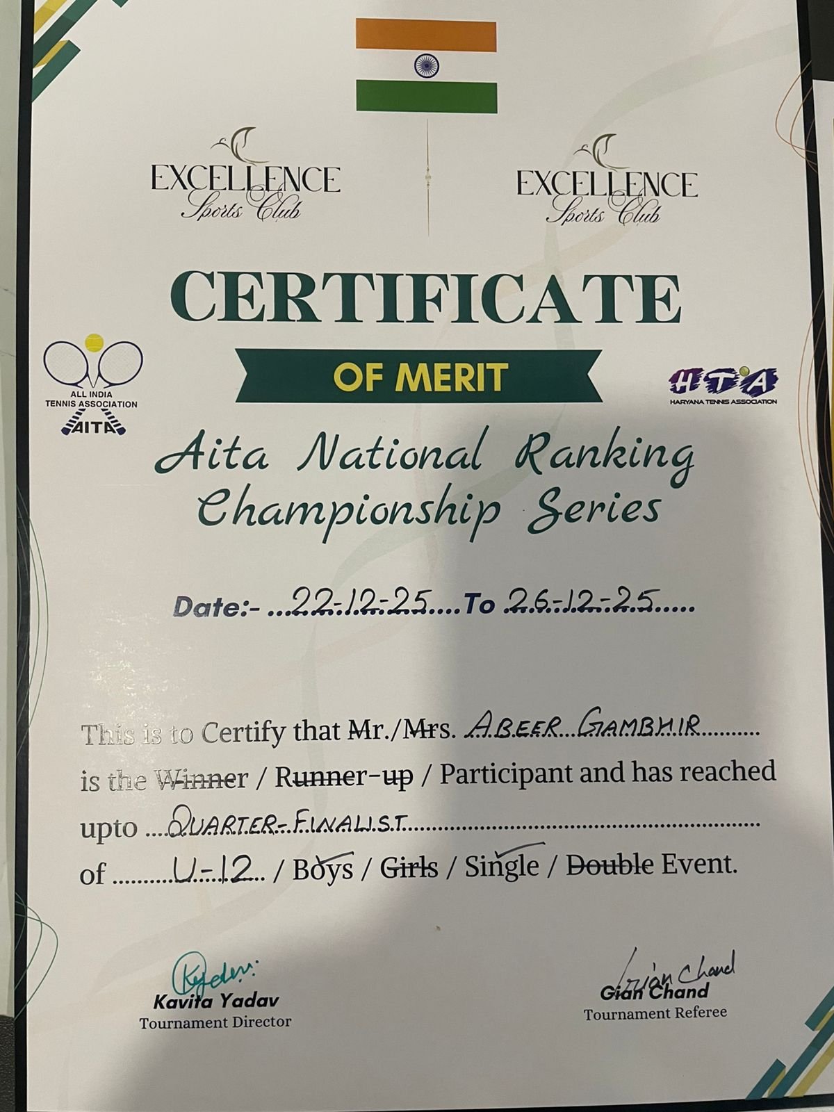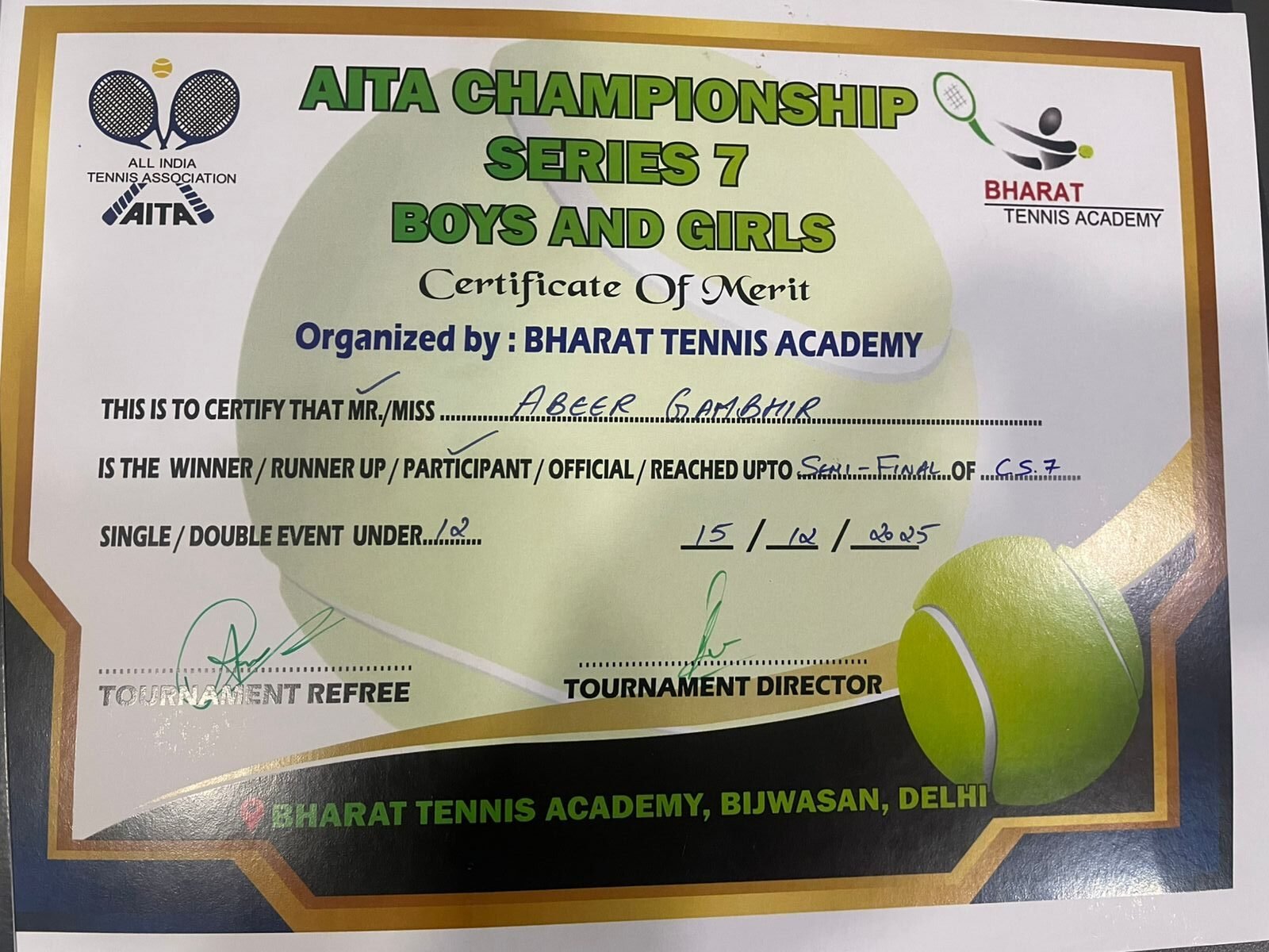 Demonstrating remarkable skill, determination, and sportsmanship, Abeer secured a Semi-Final Position in the Delhi tournament and emerged as a Quarter-finalist in the Gurugram tournament.